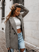 Dames blazer met een dubbelrijige knoopsluiting. Voorzien van een reverskraag en lange mouwen. De voorzijde is uitgerust met paspelzakken met klep.