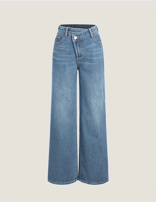 Dames spijkerbroek met wijde pijpen en asymmetrische tailleband