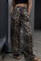 Damesbroek met lange rechte pijpen en een all-over luipaardprint. Voorzien van een elastische tailleband. De broek heeft twee zijzakken. De pijpen vallen wijd en los.