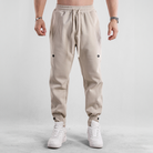 Joggingbroek voor heren met elastische tailleband en trekkoord. De joggingbroek heeft zijzakken. De pijpen zijn afgewerkt met elastische boorden en drukknopen.