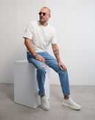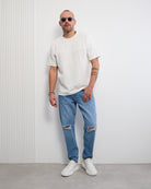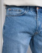 Deze heren spijkerbroek heeft een knoopsluiting. Het ontwerp is voorzien van riemlussen en steekzakken. De broekspijpen hebben een rechte pasvorm. Aan de voorkant zitten scheuren.