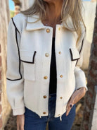 Dames jas met lange mouwen en een klassieke kraag. Aan de voorkant zit een doorlopende knoopsluiting met ronde knopen. De jas heeft twee borstzakken met klep en contrasterende biezen langs de naden. Onderaan bevindt zich een verstelbaar trekkoord voor een aangepaste pasvorm.