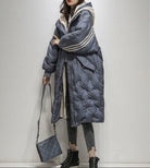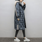 Dames winterjas met lange mouwen en capuchon. Voorzien van een ritssluiting. De jas is lang van model en heeft een gewatteerd patroon. Afgewerkt met elastische manchetten.