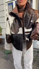 Damesjas met opvallende koeienprint en opstaande kraag. Voorzien van lange mouwen en een ritssluiting. De jas heeft een rechte pasvorm.