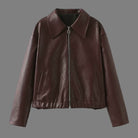 Damesjas van imitatieleer met ritssluiting. De jas heeft een kraag en twee zijzakken. De onderkant is licht geplooid voor een subtiele afwerking.