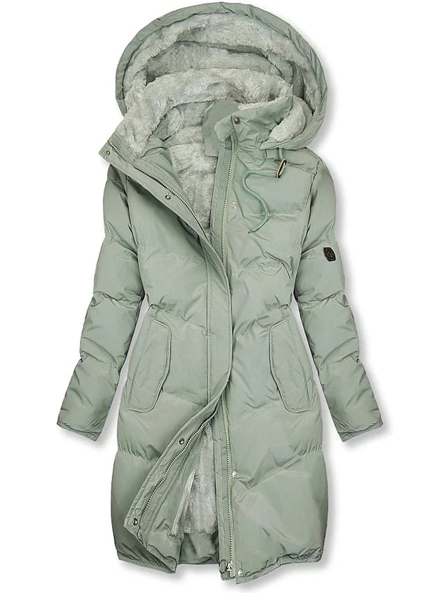 Dames winterjas met lange mouwen en een doorlopende ritssluiting. Voorzien van een vaste capuchon en imitatiebont-voering aan de binnenzijde. De winterjas heeft twee voorzakken met klep en drukknopen.