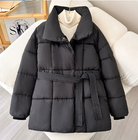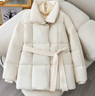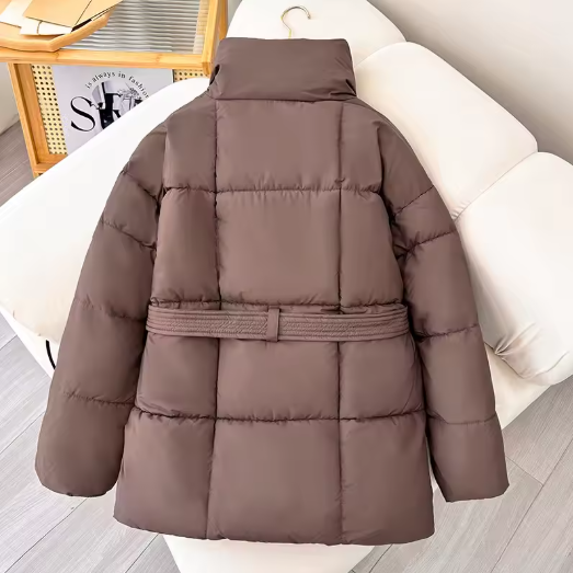 Deze gewatteerde winterjas voor dames heeft een recht vallend ontwerp. De jas is voorzien van een brede kraag en een sluiting met drukknopen. Rond de taille zit een afneembare ceintuur waarmee de pasvorm kan worden aangepast.