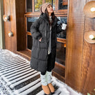 Lange gewatteerde winterjas met capuchon en ritssluiting voor dames. Voorzien van een verstelbaar trekkoord. De jas heeft lange mouwen met elastische manchetten. De jas heeft een rechte zoom en een borstzak met rits aan de voorkant.