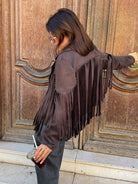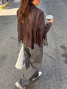 Suède jas voor dames met franjes op de mouwen en achterkant. De jas heeft een kraag en een open voorkant. De jas valt tot op de heupen.