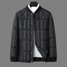 Herenjas met gewatteerde structuur in een vierkant steekpatroon. Voorzien van opstaande kraag. De jas heeft een knoopsluiting aan de voorkant. Geribde manchetten aan de mouwuiteinden.