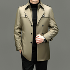 Herenjas met lange mouwen en een rechte snit. Ontworpen met een reverskraag en schouderstukken. De jas heeft een double-breasted voorkant met zichtbare knopen. De manchetten hebben knoopsluitingen.
