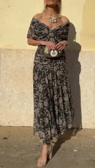 Damesjurk met gedrapeerde, schoudervrije halslijn. De jurk heeft een bloemenprint over de hele stof en een aansluitend middenstuk. Het ontwerp heeft een geplooide rok die tot net boven de enkels valt. De jurk heeft een gedraaid detail aan de voorkant bij de borst.
