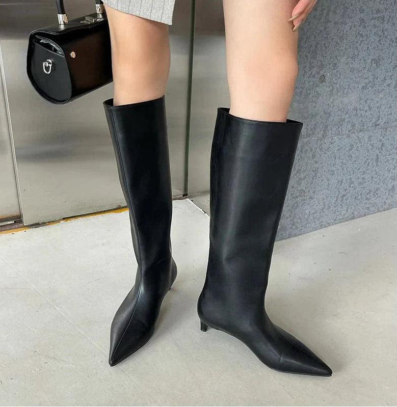 Deze dames hoge laarzen hebben een smalle, puntige neus en een lage hak. De laarzen hebben een glad oppervlak zonder zichtbare sluiting. De schacht reikt tot net onder de knie en heeft een recht model.