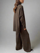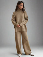 Dames loungeset bestaande uit een top met lange mouwen en een wijde broek. Het topje heeft een hoge colkraag en een rechte, losvallende pasvorm. De broek is lang en heeft wijde pijpen. Beide delen zijn gemaakt van acryl en nylon en tonen een gelijkmatig breisel over het gehele oppervlak.