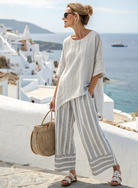 Dames set van bamboe hennep, bestaande uit een tunic topje en een wijde broek. Het topje heeft een ronde halslijn, een korte knoopsluiting aan de voorkant, ellebooglange mouwen en een asymmetrische onderkant. De broek heeft een volledig wijde snit, een gestreept patroon en zichtbare steekzakken aan de zijkant.