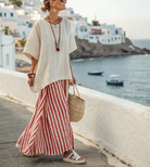 Dames set van bamboe hennep, bestaande uit een tuniek topje en een lange rok. Het topje heeft een ronde halslijn, wijde korte mouwen en een rechte onderkant. De rok heeft een volledig wijde snit met verticale strepen.