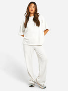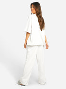 Dames loungeset bestaande uit een ruimvallend T-shirt en een lange broek. Het T-shirt heeft korte, wijde mouwen en een ronde hals. De broek is recht gesneden en is voorzien van een elastische tailleband