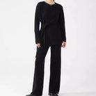 Tweedelige loungeset van viscose met gebreid patroon. Het bovenstuk heeft lange mouwen, een ronde hals en een asymmetrische overslag aan de voorzijde. De bijpassende broek heeft een rechte, wijde pijp en een elastische taille.