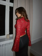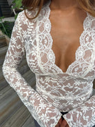 Dames kanten blouse met lange mouwen en een diepe V-hals. De blouse is gemaakt van transparant kant met een bloemmotief over het hele oppervlak. De mouwen lopen licht uit aan de uiteinden voor een verfijnd detail.