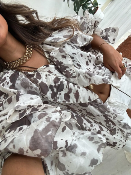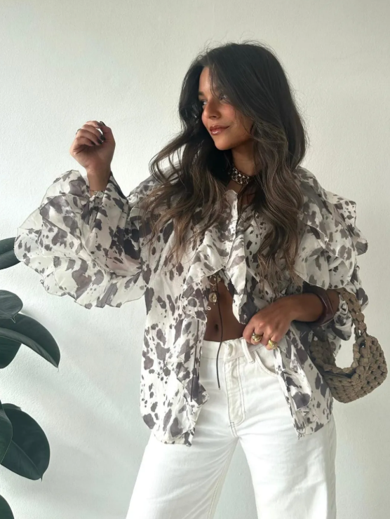 Damesblouse met een losse pasvorm en lange mouwen. Voorzien van opvallende ruches langs de halslijn en borst. De blouse heeft een semi-transparante afwerking. Het ontwerp heeft een patroon met een dierenprint uitstraling.