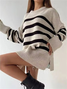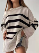 Dames trui met lange mouwen en brede horizontale strepen op de voorkant, achterkant en mouwen. Voorzien van een ronde halslijn en extra brede geribde afwerking aan de onderkant en mouwuiteinden. De trui heeft verlaagde schoudernaden en een rechte pasvorm.