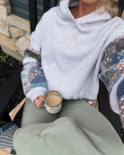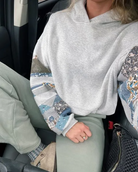 Dames trui met lange mouwen en buidelzak aan de voorkant. De mouwen hebben lapwerkdetails in verschillende kleuren en patronen. Voorzien van een capuchon en boorden aan de mouwen. De onderkant valt recht.