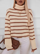 Deze coltrui voor dames heeft een opstaande kraag en lange mouwen. De trui is voorzien van horizontale strepen over het hele oppervlak. De uiteinden van de mouwen en de onderzijde hebben een geribde afwerking.