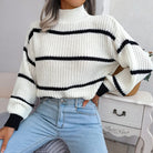 Gestreepte wintertrui voor dames met een hoge kraag. De trui heeft een ribbelstructuur en horizontale strepen over het hele oppervlak. Voorzien van geribde boorden bij hals, mouwen en onderzijde. Gemaakt van spandex.