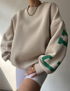 Dames trui met ronde hals en lange mouwen. De trui heeft een losvallend model met verlaagde schoudernaden. Voorzien van ribgebreide boorden bij de hals, mouwen en onderzijde.