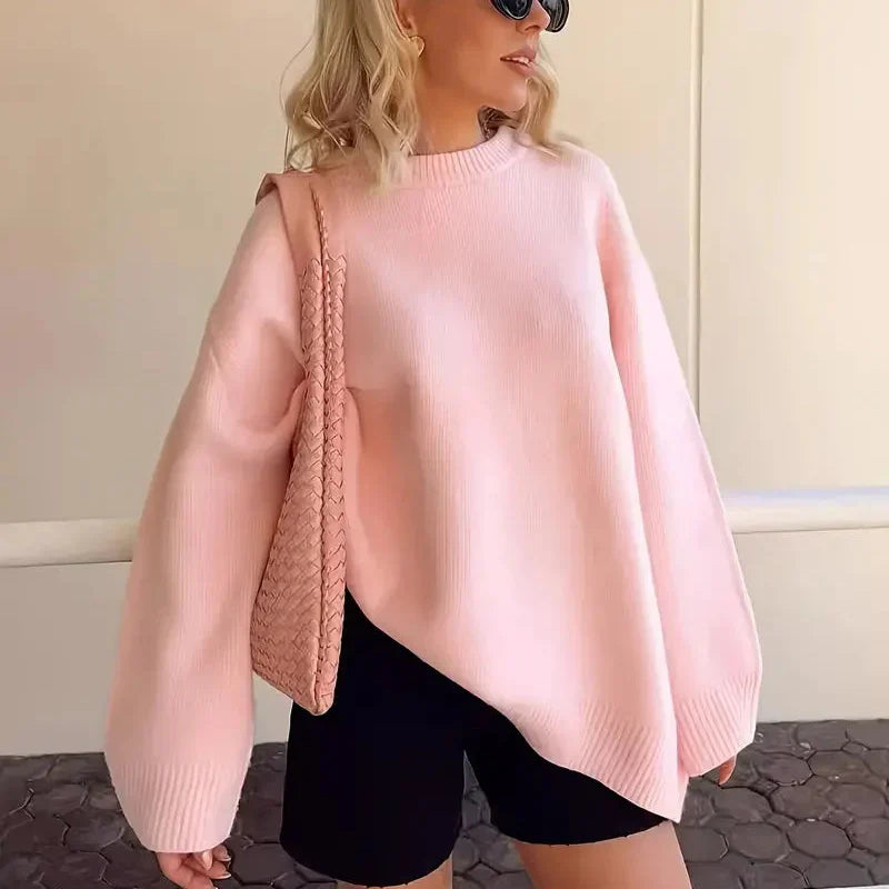 Roze oversized trui voor dames met ronde hals en lange mouwen. De trui heeft een ruime pasvorm die losjes rond het lichaam valt. Voorzien van geribde boorden aan de hals, mouwen en onderzijde.