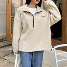 Dames trui met lange mouwen en een opstaande kraag. Voorzien van een halve ritssluiting. De trui heeft een rechte onderrand.