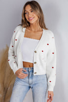 Dames vest met lange mouwen en V-hals. Voorzien van een knoopsluiting. Het vest heeft een gebreide structuur met hartjesmotieven. Afgewerkt met een rechte onderkant en ribgebreide boorden.