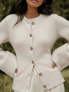 Dames vest met lange uitlopende mouwen en ronde hals. Het vest is aan de voorzijde voorzien van een knoopsluiting. De onderzijde en manchetten hebben een ribgebreide afwerking.