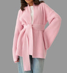 Gebreid dames vest met een diepe V-hals en lange, wijd uitlopende mouwen. Voorzien van een strikceintuur. Het vest heeft een grof ribbreisel over het hele oppervlak. De mouwen hebben brede omgeslagen boorden.