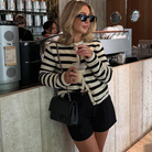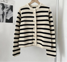 Dames gebreid vest met lange mouwen en ronde hals. Het vest is ontworpen met een knoopsluiting. Voorzien van een gestreept patroon over het gehele oppervlak. De manchetten en onderzijde zijn netjes afgewerkt. Gemaakt van viscose.