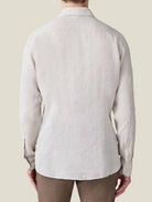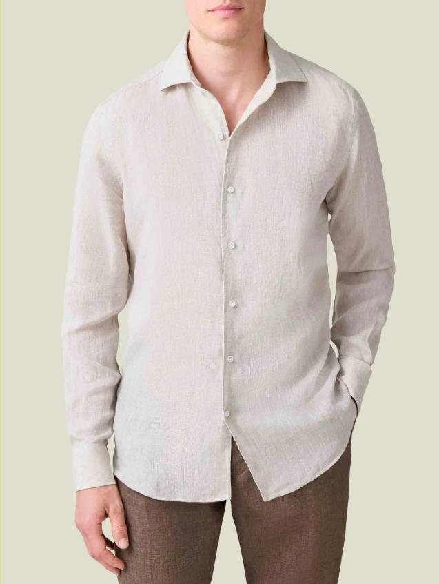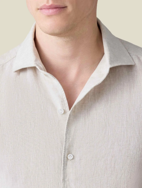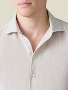 Beige herenoverhemd met lange mouwen en knoopsluiting aan de voorkant. Voorzien van een puntkraag en zichtbaar structuurpatroon. Het overhemd heeft een afgeronde zoom en geknoopte manchetten.
