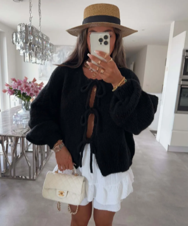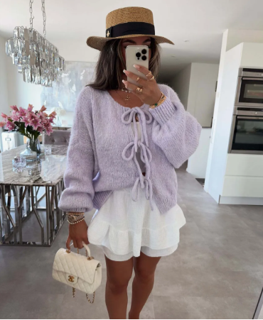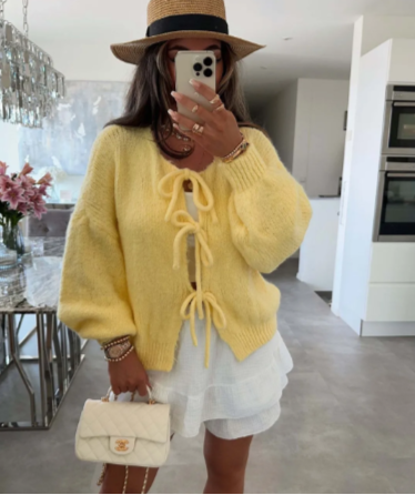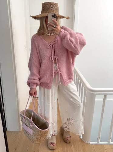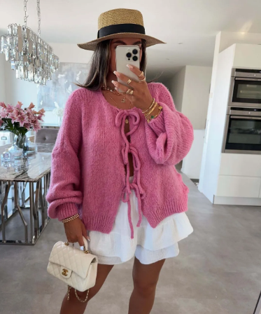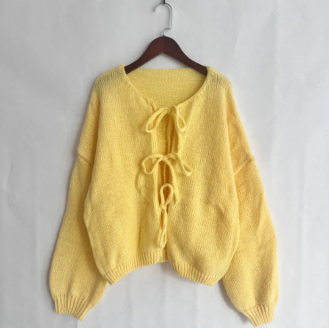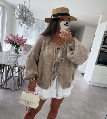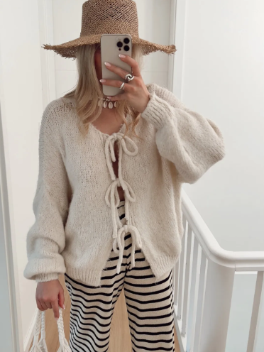 Dames vest met lange mouwen en een ronde halslijn. Het vest heeft drie striksluitingen aan de voorkant. Voorzien van een gebreide structuur over het hele oppervlak. De onderzijde en mouwuiteinden zijn elastisch afgewerkt.