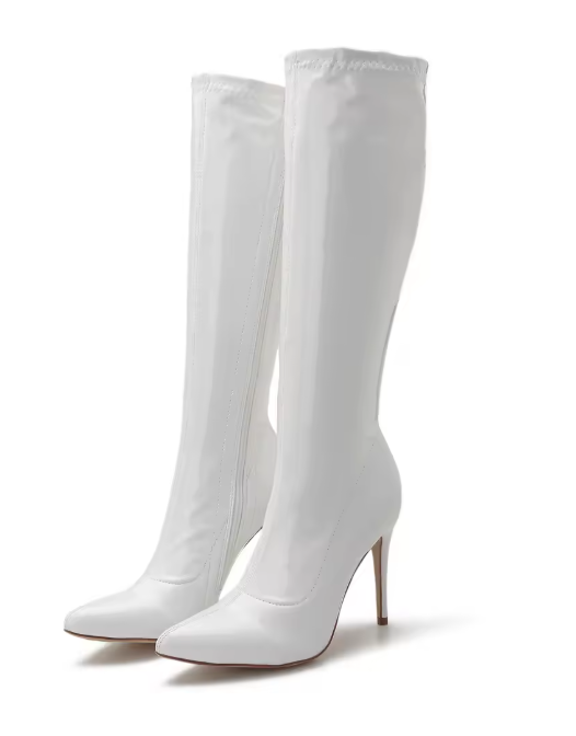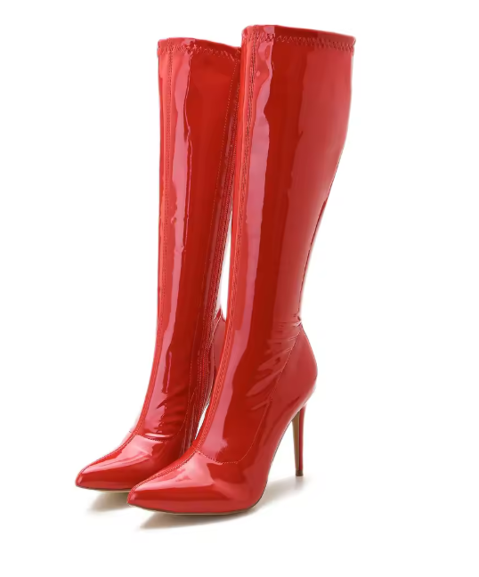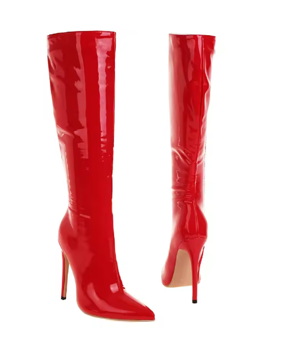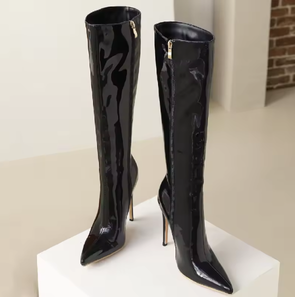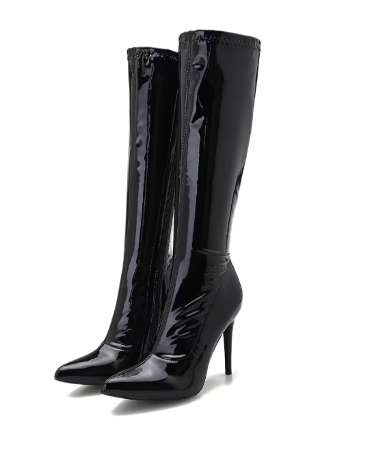 Dames hoge laarzen met een schacht tot net onder de knie. Voorzien van een smalle stilettohak en een puntige neus. De laarzen hebben een lange ritssluiting aan de zijkant.
