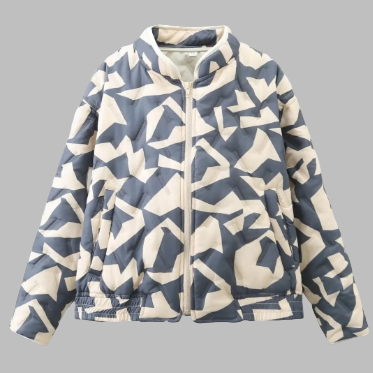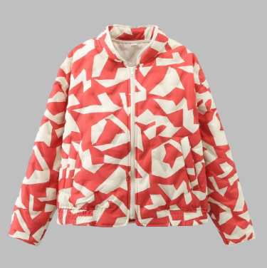 Damesjas met opstaande kraag. Voorzien van een ritssluiting aan de voorkant en twee zijzakken. De jas heeft een print over het hele oppervlak. Afgewerkt met elastiek aan de onderkant.