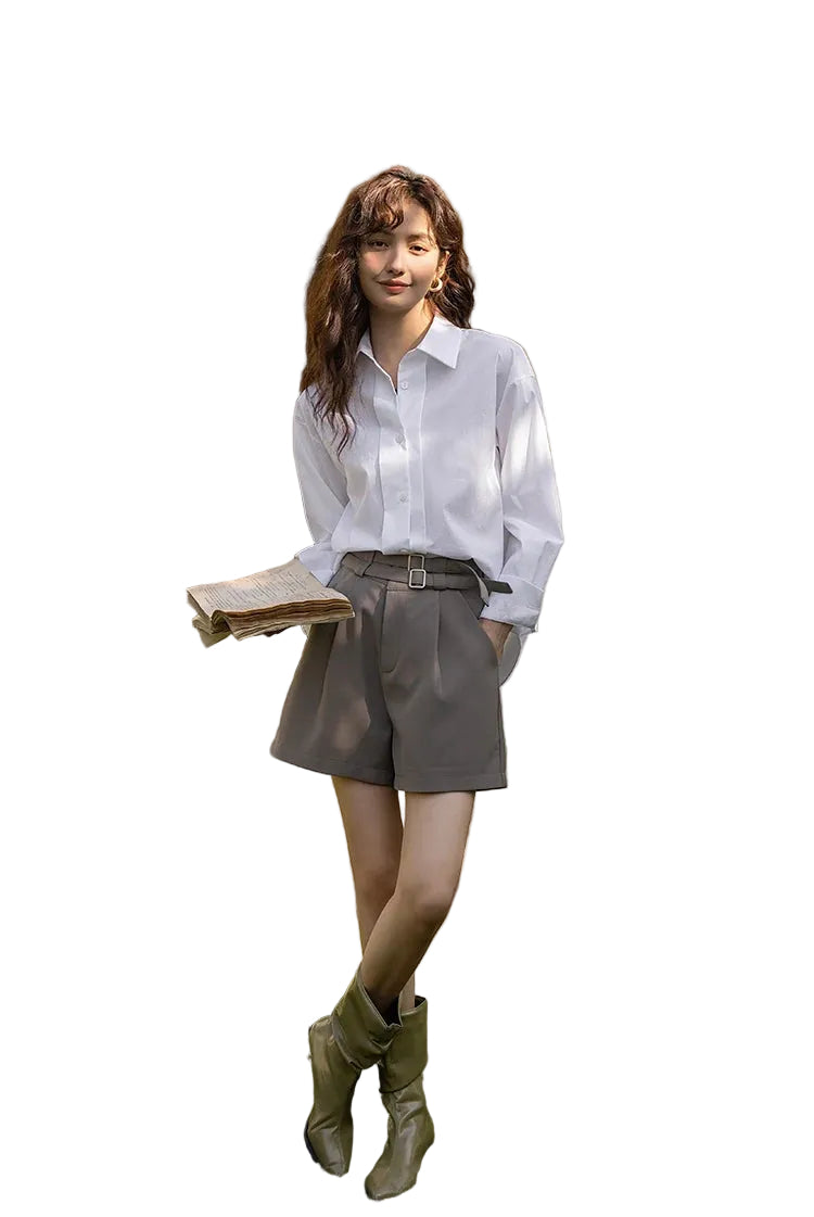 - Halslijn: Klassieke kraag met knoopsluiting