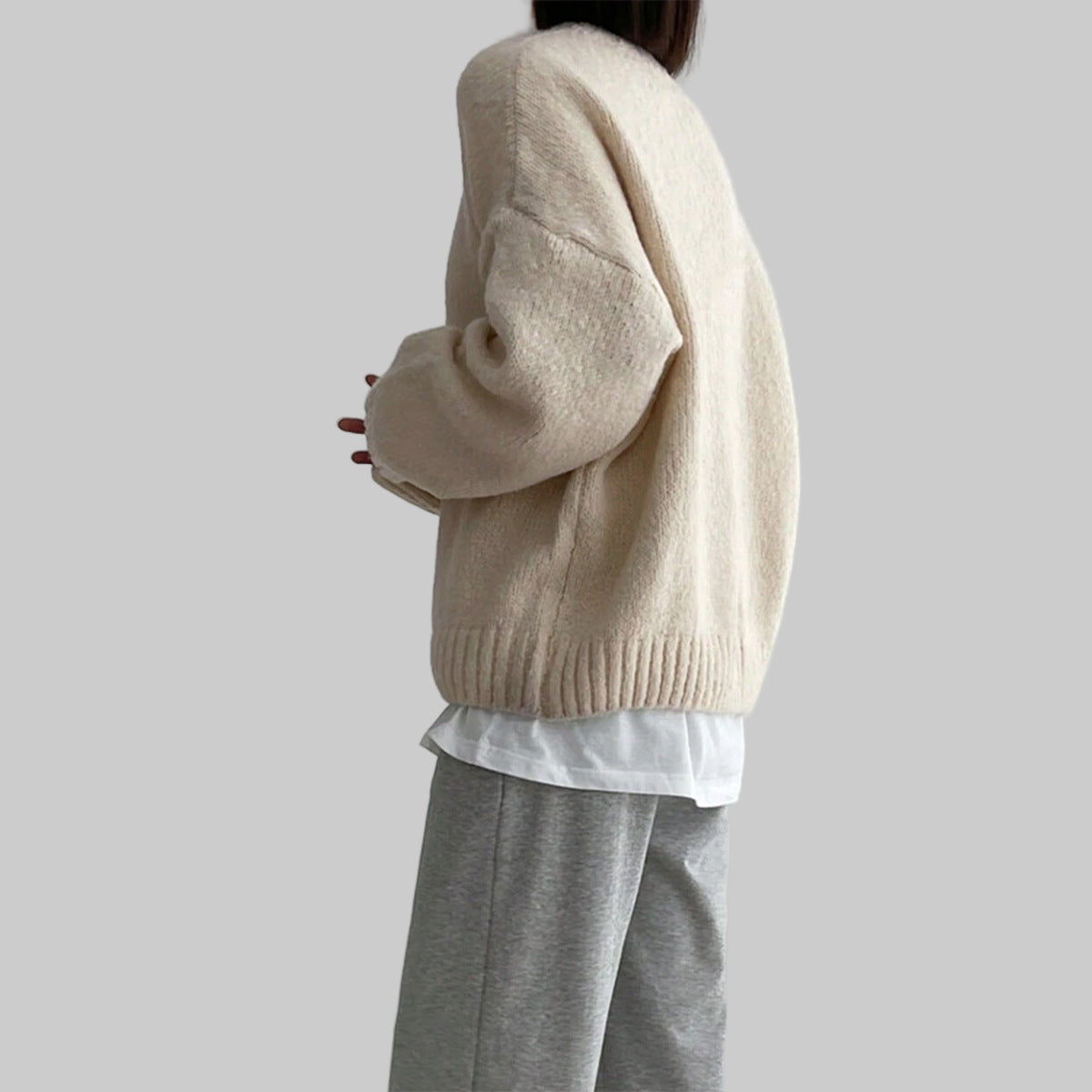 Dames trui met lange mouwen en een ronde hals. De trui heeft een losse pasvorm en een gebreide structuur. Voorzien van brede boorden aan de mouwen en onderzijde.