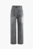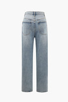 Deze dames spijkerbroek heeft een asymmetrische tailleband met knoop en ritssluiting. Het ontwerp is voorzien van riemlussen en steekzakken. De broekspijpen zijn wijd gesneden en vallen recht naar beneden. Aan de achterzijde zitten opgestikte achterzakken.