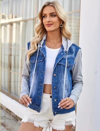 Een dames spijkerjas met een knoopsluiting aan de voorkant. Ontworpen met lange mouwen en geribde boorden. Het jack heeft een capuchon met trekkoorden. Afgewerkt met klepzakken aan de voorkant en steekzakken.