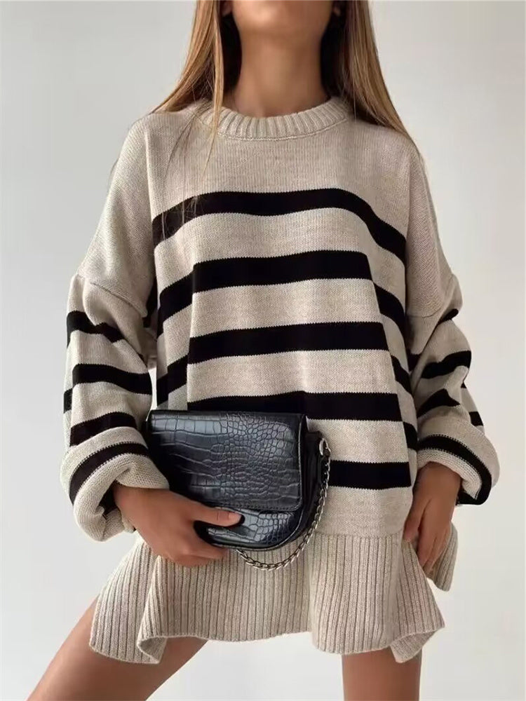 Dames trui met lange mouwen en brede horizontale strepen op de voorkant, achterkant en mouwen. Voorzien van een ronde halslijn en extra brede geribde afwerking aan de onderkant en mouwuiteinden. De trui heeft verlaagde schoudernaden en een rechte pasvorm.