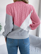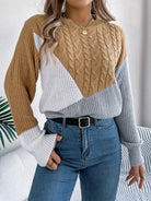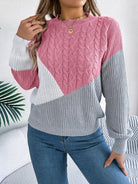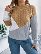 Dames wintertrui met ronde hals en lange mouwen. De voorkant combineert gebreide kabeldetails met effen vlakken . Voorzien van geribde afwerking bij hals, manchetten en onderzijde.
