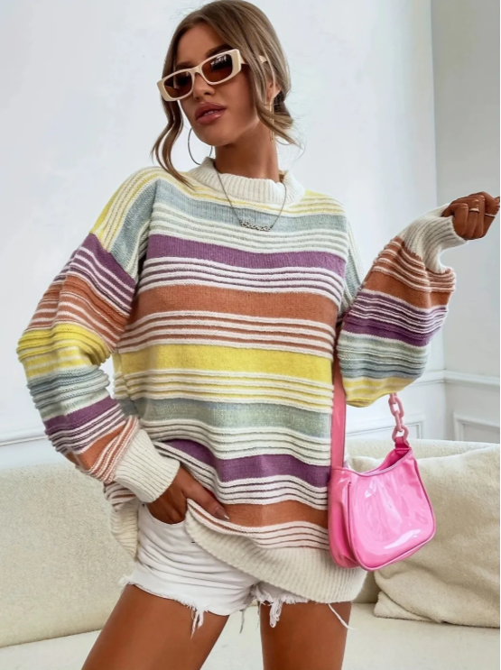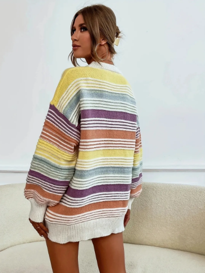 Damestrui met ronde hals. Met lange mouwen en een rechte zoom. Het ontwerp is voorzien van een horizontaal streeppatroon. Afgewerkt met geribde boorden bij de hals, mouwen en onderkant.