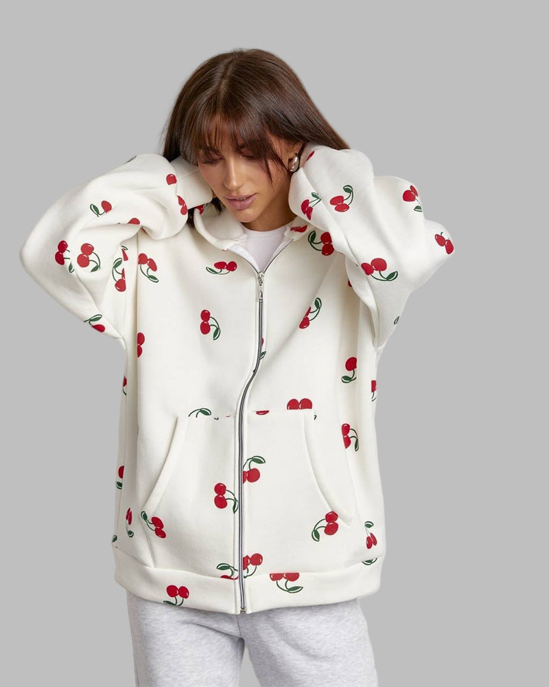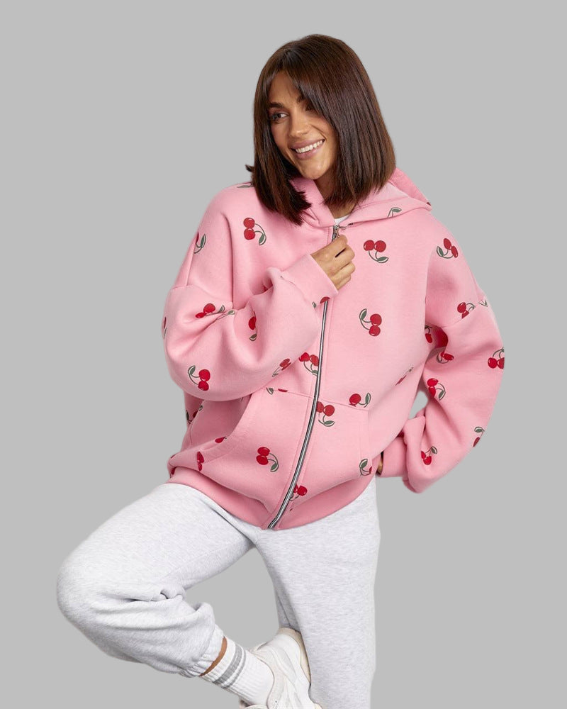 Damesvest met lange mouwen en capuchon. Voorzien van ritssluiting. De jas heeft een kangoeroezak aan de voorkant. Afgewerkt met een kersenprint over het hele oppervlak.