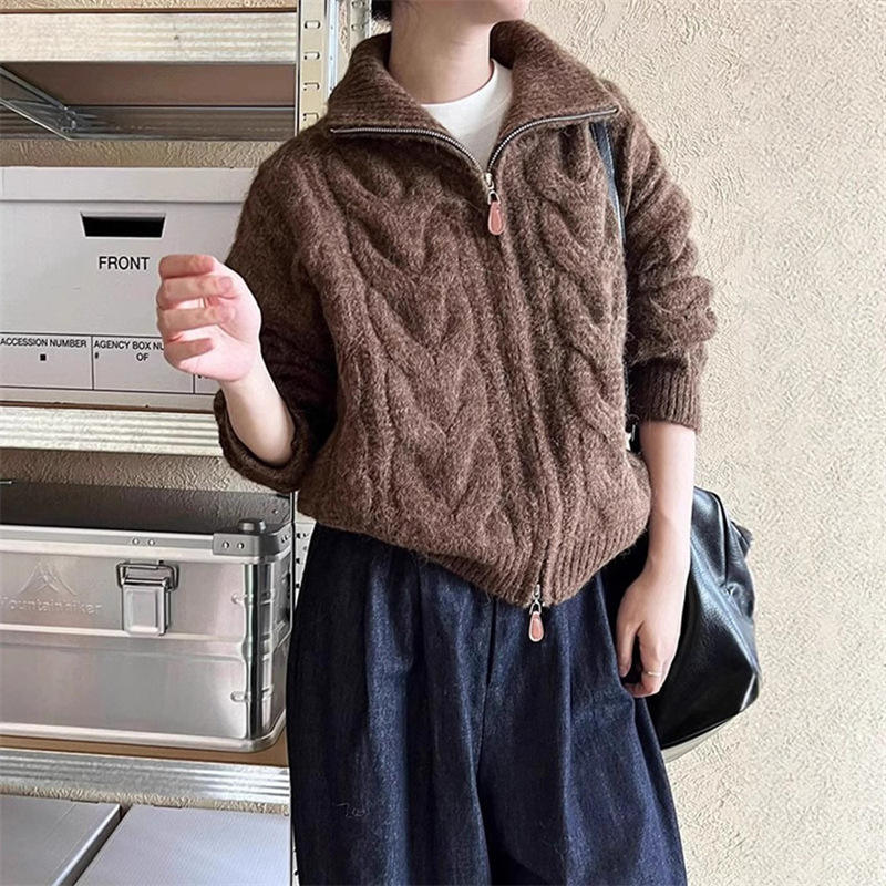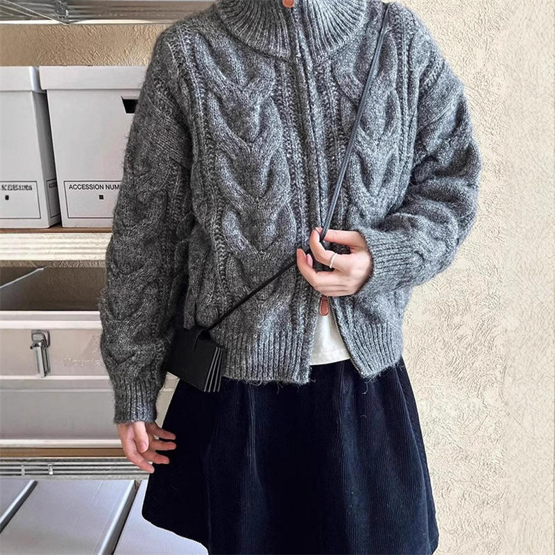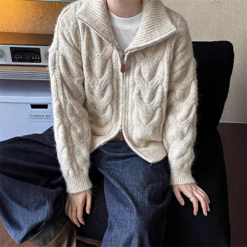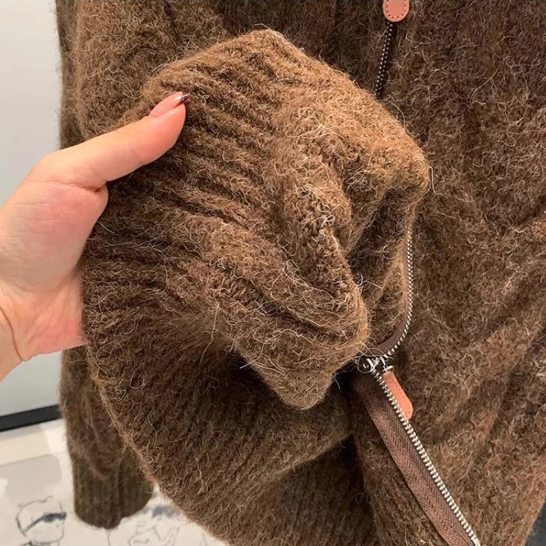 Dames wintervest in los gebreid ontwerp met kabelpatroon. Voorzien van een hoge kraag die open of omhoog gedragen kan worden. Het vest sluit met een tweeweg rits en heeft geribde boorden bij kraag, manchetten en onderkant.