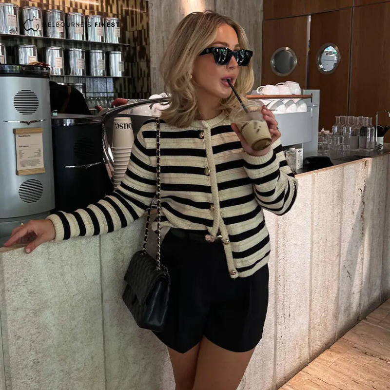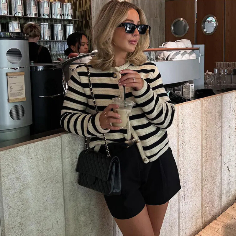 Dames gebreid vest met lange mouwen en ronde hals. Het vest is ontworpen met een knoopsluiting. Voorzien van een gestreept patroon over het gehele oppervlak. De manchetten en onderzijde zijn netjes afgewerkt. Gemaakt van viscose.