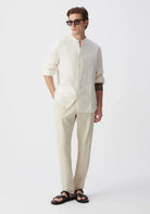 Heren overhemd met lange mouwen en een staande kraag. Het overhemd heeft een knoopsluiting aan de voorzijde en een rechte onderzijde. De mouwen zijn afgewerkt met manchetten met knoop.